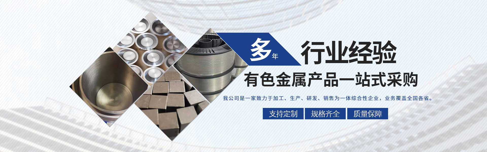 寶雞市創(chuàng)匯金屬材料有限公司,位于有“中國鈦谷”之稱寶雞寶鈦路南段,這里也是國家重點支持和扶持的有色金屬材料資源產(chǎn)業(yè)基地,我司專業(yè)從事鈦、鋯、鉿、鎳鉻、鎢鉬、鉭鈮、合金材料、復合材料,板、棒、絲、管、箔材等,設備制造,金屬制品機械加工銷售。